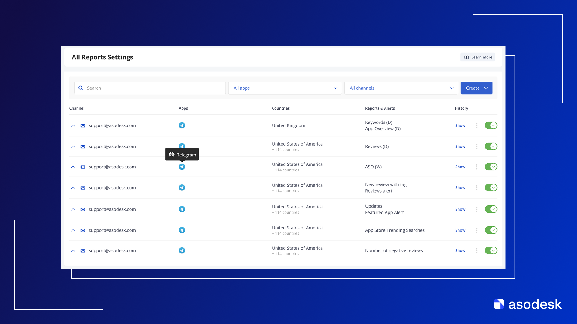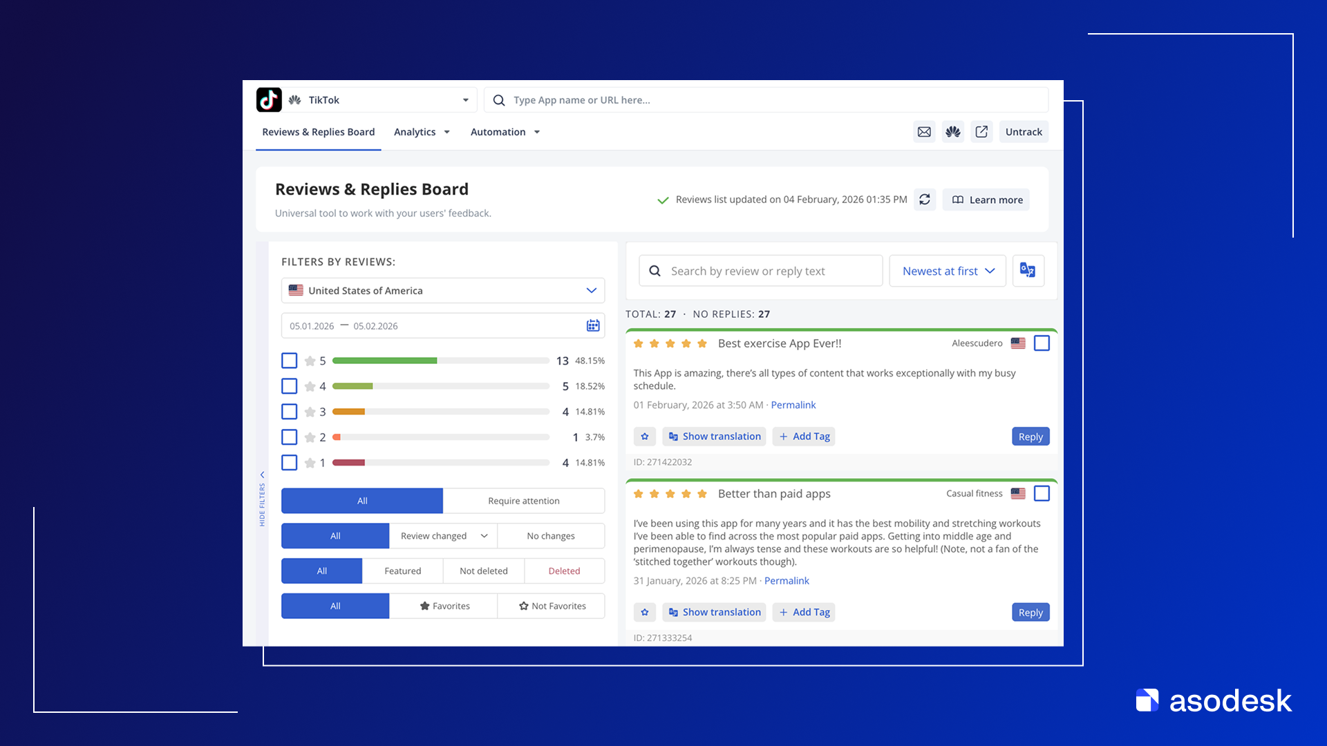 The Reviews & Replies Board is Asodesk’s core tool for managing app reviews. It streamlines the review monitoring process across app stores, ensuring that no valuable feedback goes unnoticed.