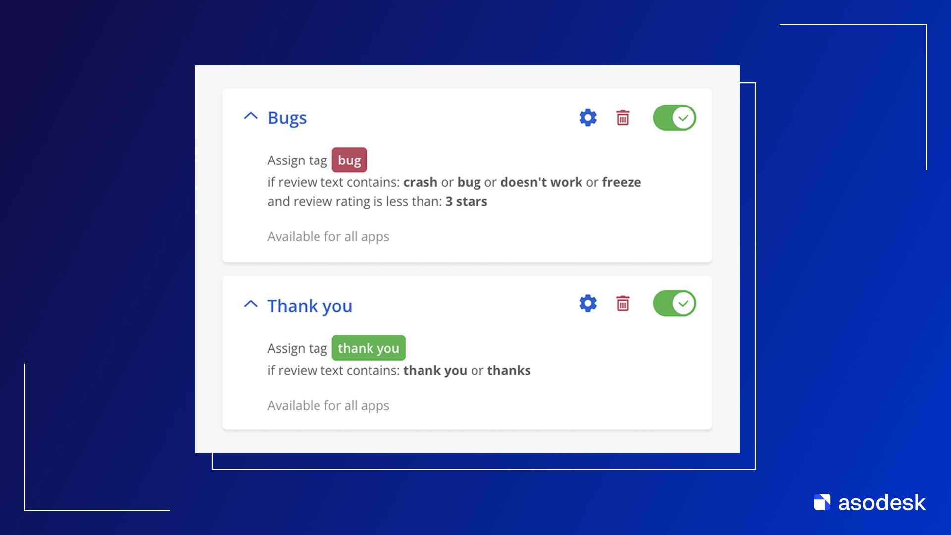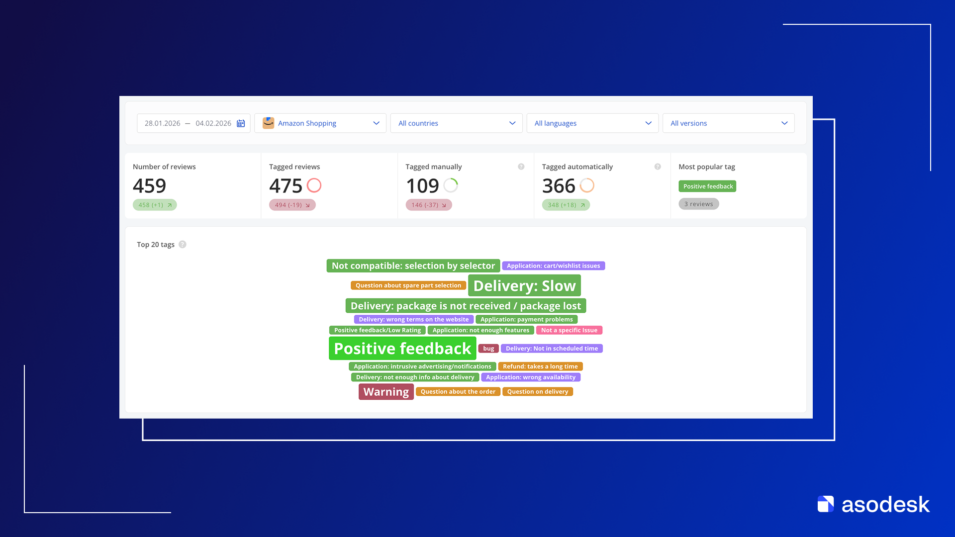 Auto-tags is a tool that helps you categorize user reviews to identify trends and recurring issues.